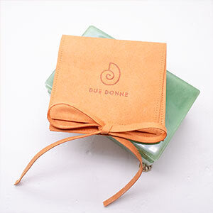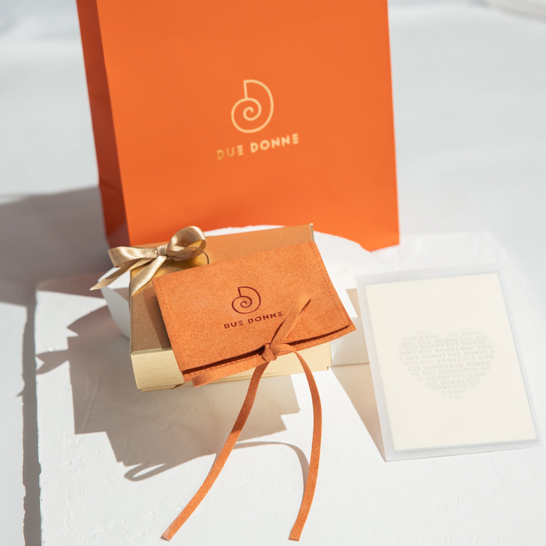 ポーチとジュエリーをゴールドのボックスにお入れしてリボンをかけ、手渡し用のショッピングバックをセットにしてお届けします。特別な贈り物におすすめです。